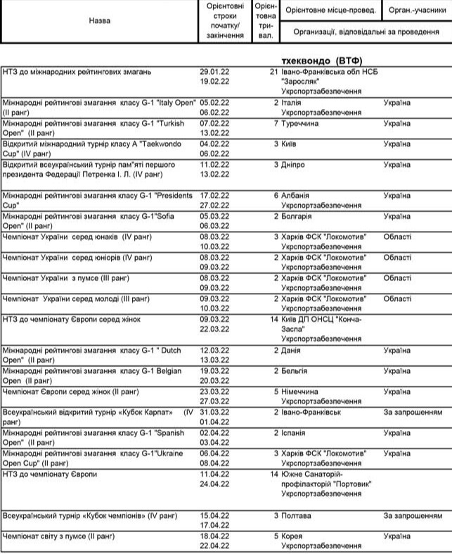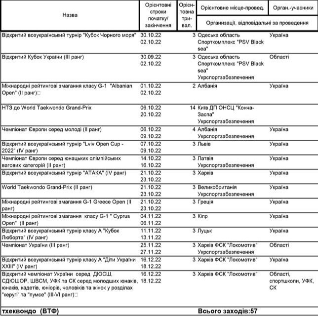 Тхеквондо-2022: календарний план спортивних заходів